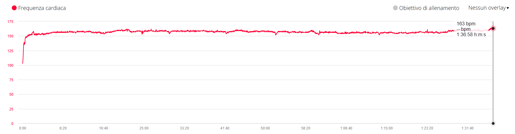 Ricordo che il nostro obiettivo era quello di rimanere in prossimità della frequenza critica  (soglia anaerobica)  e soprattutto di non superarla frequentemente rimanendo all’interno del range 156/160 bpm
