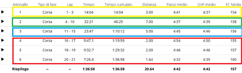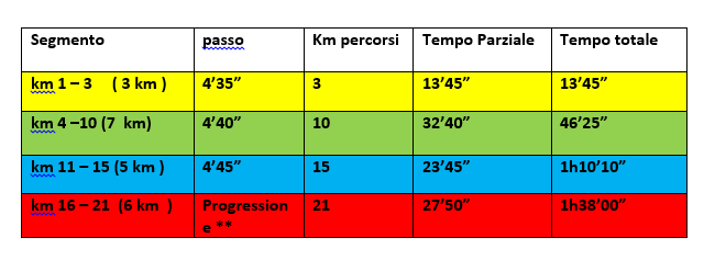 Per correttezza professionale aggiungiamo il parziale mancante ottenuto grazie alla media della progressione dell’ultimo segmento per cui dobbiamo aggiungere un minuto al tempo del segmento ; l’atleta avrebbe pertanto chiuso la prestazione in circa  1h38’, centrando perfettamente l’obiettivo personale.