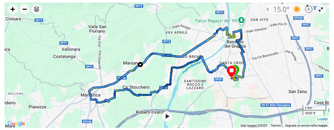 Un percorso tortuoso per i primi 3/4 km all’interno del centro storico di Bassano, a seguire un segmento filante a raggiungere Marostica ( 10° km ) e poi  la seconda parte in continua anche se leggera ascesa per tornare al punto di partenza, il campo di atletica di  Bassano del Grappa. ( ascesa totale 80 mt. circa)