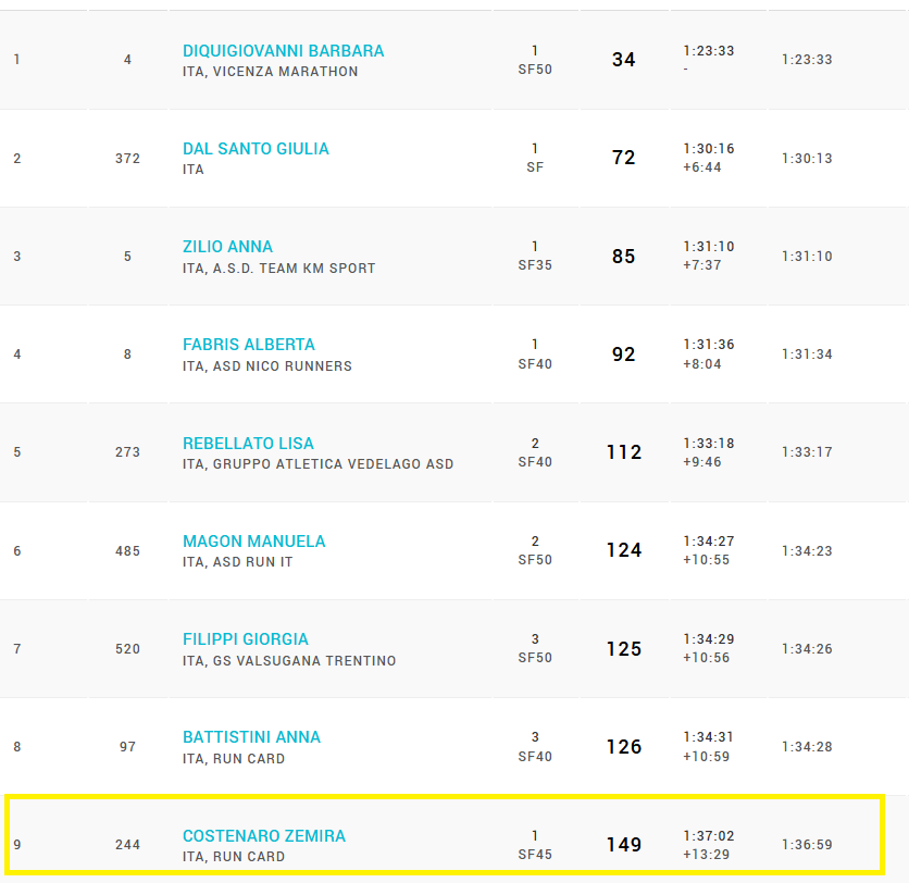 Dal punto di vista assoluto , la prestazione in se è relativa, non è una prestazione che può annoverarsi tra i migliori tempi della categoria assoluta  ma non è questo il focus del nostro ragionamento ; si tratta di un atleta donna di buon livello ma pur sempre amatoriale , ad oggi con scarsa esperienza nel mondo del fondo su strada , all’attivo solo una mezza maratona disputata sempre sullo stesso percorso , dove tra l’atro  ha fatto segnare ben 11 ‘ in più rispetto a questa che andiamo ad analizzare.