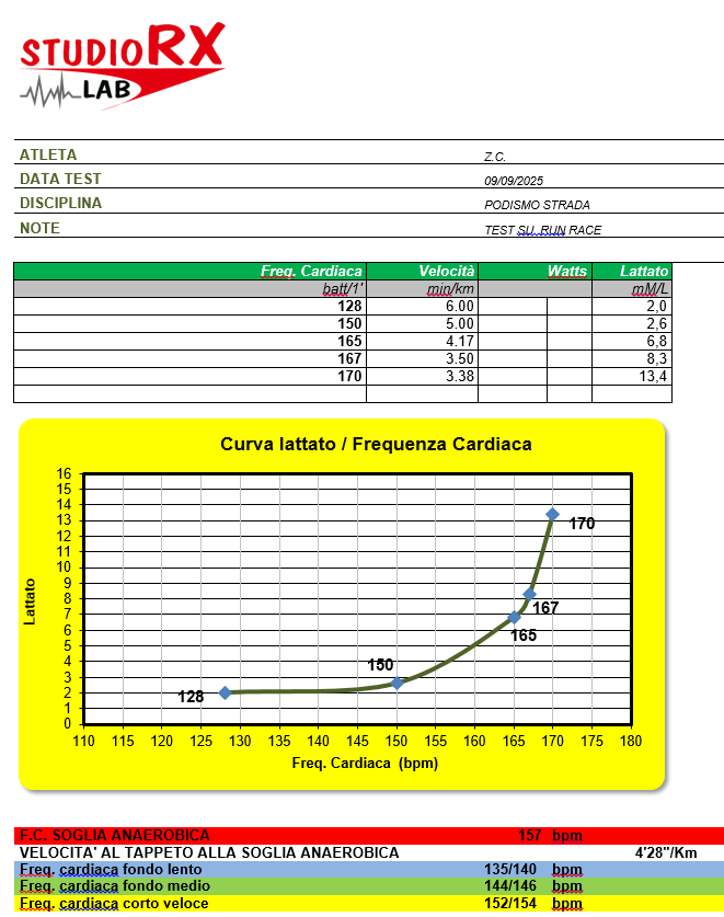 L’atleta in questione Z.C. è a conoscenza dei dati metabolici personali determinati da un recente test incrementale massimale con rilevamento del lattato ematico.